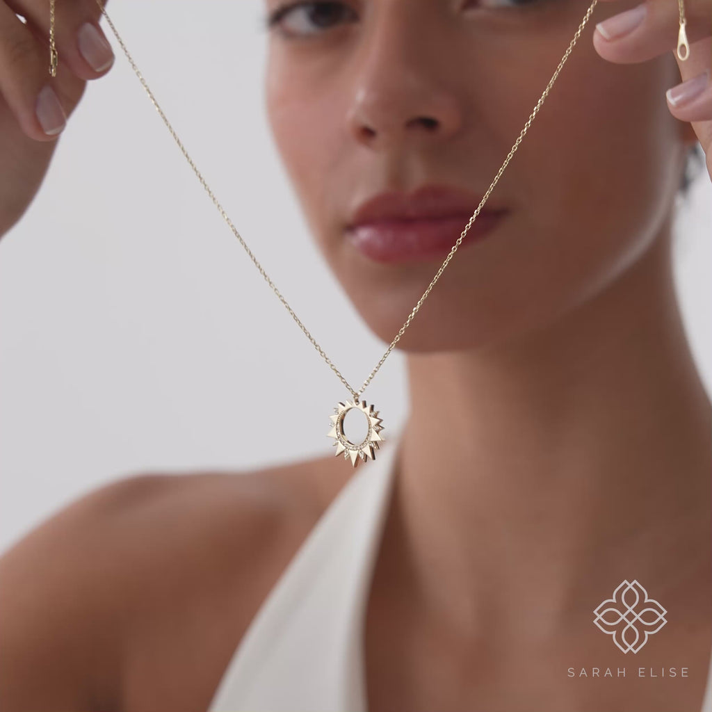 Bring a touch of cosmic energy to your collection with our Gold Sunburst Diamond Accent Necklace. Crafted in lustrous solid gold, this captivating piece features a delicate open sun motif. The minimalist gold rays are beautifully accented with sparkling natural diamonds, creating a subtle yet dynamic flash of light.