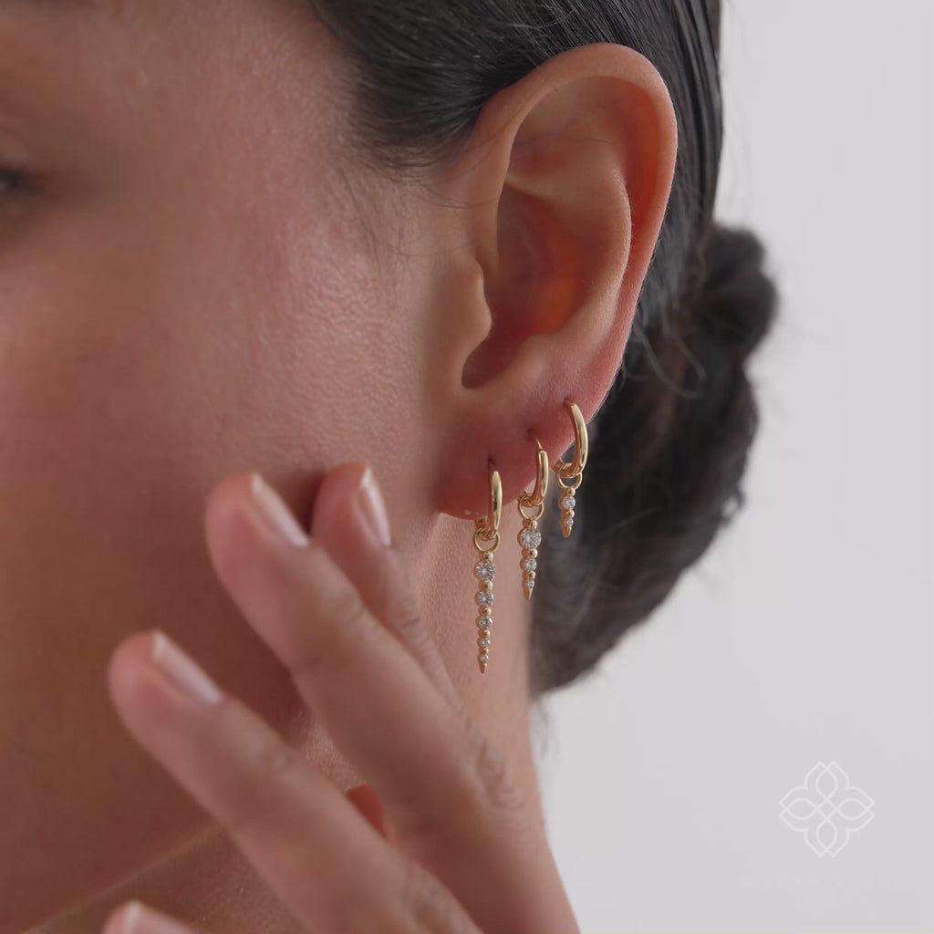 Embrace your style with a touch of fluid glamour and modern edge. This exquisite set features three small solid gold huggie hoops, each adorned with a graceful drop of lab-grown diamonds that culminates in a sleek, polished gold spike. The delicate, alternating pattern of brilliant diamonds and sharp gold points creates a dynamic, high-fashion aesthetic.
