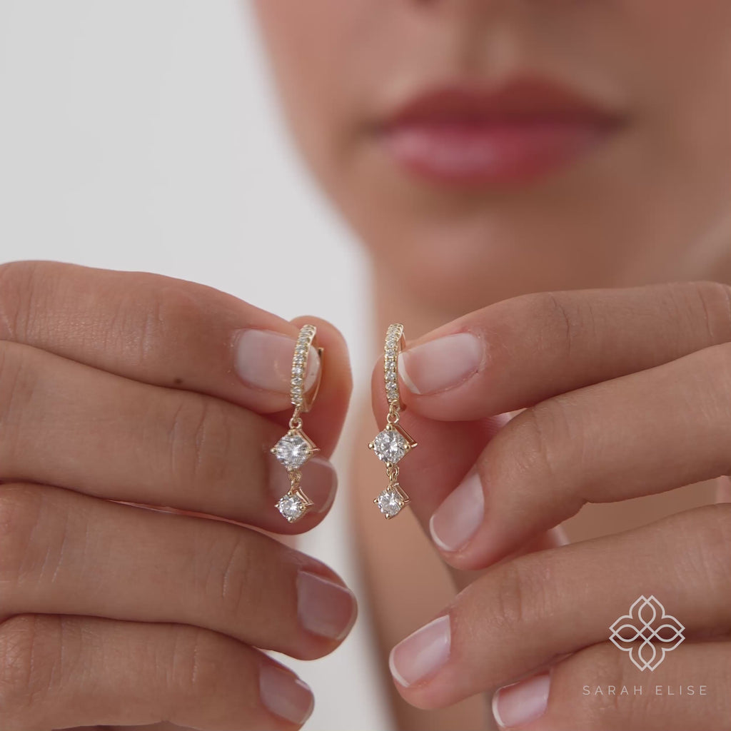 Embrace your style with a touch of elegant flair in our Geometric Diamond Drop Huggie Hoops. Crafted in lustrous solid gold, these exquisite earrings begin with a small, textured huggie hoop adorned with subtle pave-set diamonds. Gracefully suspended from the hoop is a stunning cascade of two brilliant round cut lab-grown diamonds, meticulously set to maximize their angular sparkle.