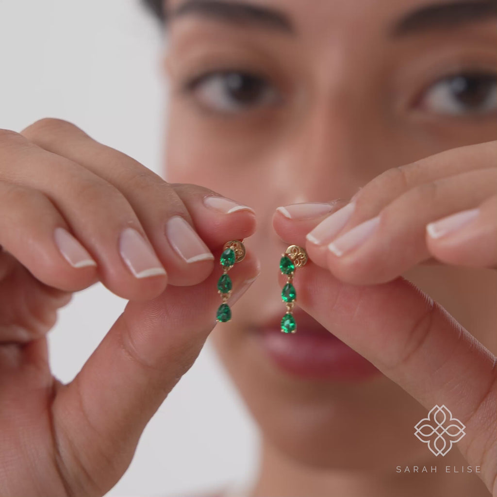 Find your new signature piece in our stunning Lab Emerald Drop Earrings. These exquisite earrings are designed for versatility, featuring three pear cut lab emeralds. This elegant design is perfect for adding a touch of unparalleled sparkle and color to weddings, galas, or any special occasion, ensuring you shine in any setting.