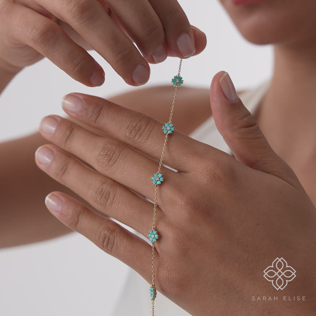 Embrace delicate charm with our Solid Gold Turquoise Flower Bracelet. Crafted in lustrous solid gold, this exquisite piece features five beautifully detailed floral stations. Each dainty flower boasts vibrant natural turquoise petals, radiating around a brilliant lab-grown diamond center, creating a captivating sparkle within its cheerful design.